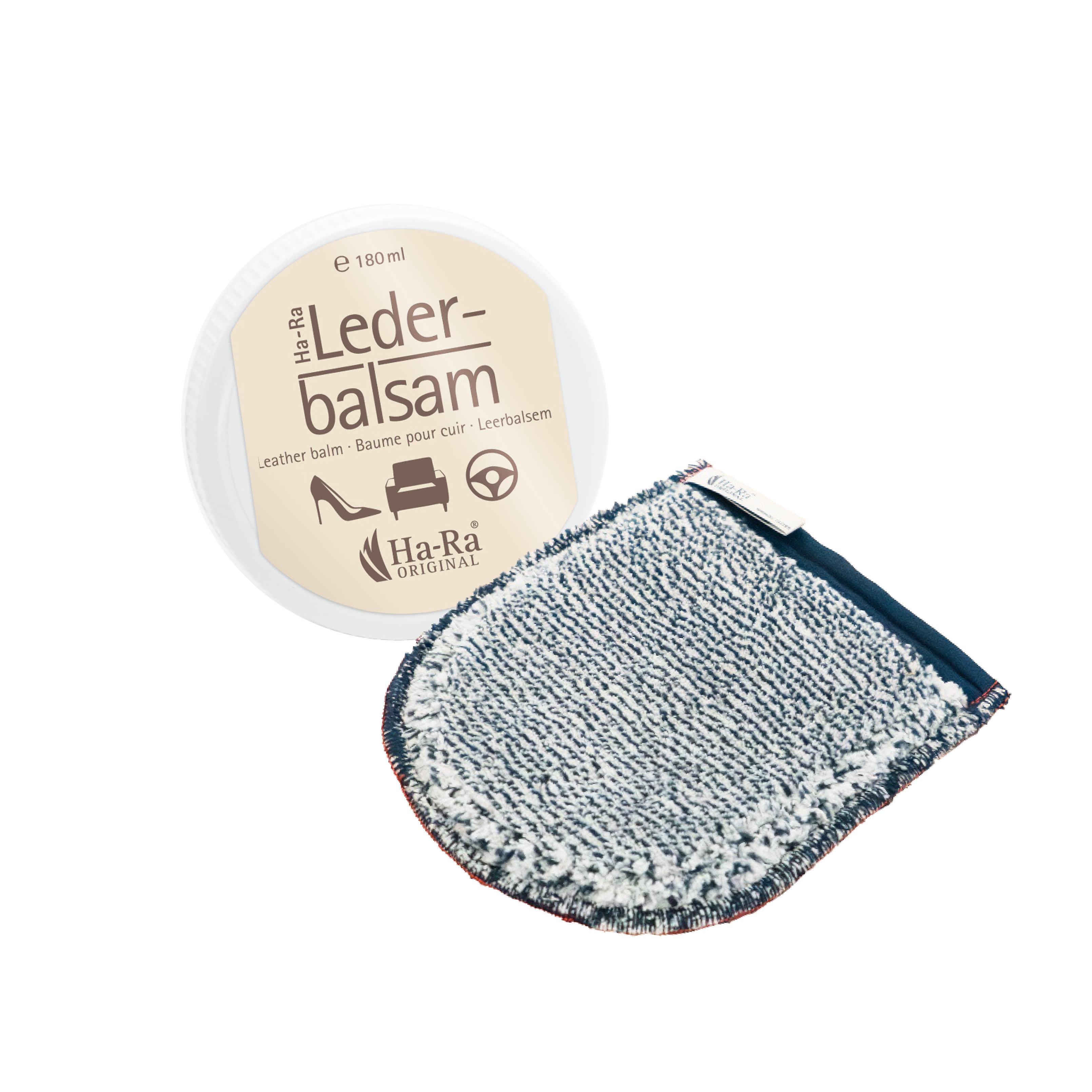 Onze leerbalsem van zuivere bijenwas en lanoline voedt, verzorgt en impregneert glad leer in één handeling. De beste vriend van de leerbalsem is de Ha-Ra Lederverzorgingshandschoen met een blauw-gemêleerde kant om te reinigen en een witte kant om na te polijsten.